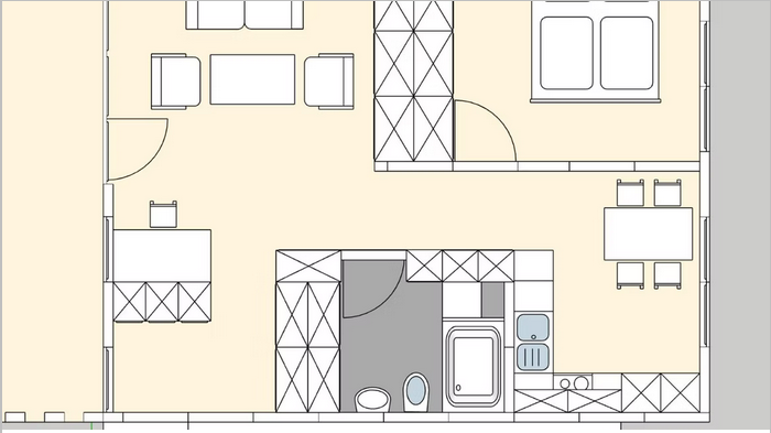 Hier wurde die Eingangssituation verlegt, wodurch eine großzügige Eingangssituation mit ausreichend Schränken möglich ist. Die Küche wurde verlegt und weniger Türen eingeplant.